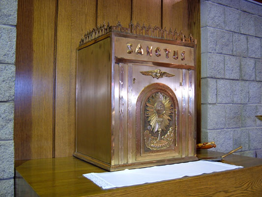 A fire destroyed our first tabernacle in November 1986, and in 1987 St. Philip Neri Mission gave us this one; which they got from St. Mary Parish (which is now closed).