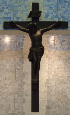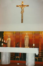 Sculpted from wood, this 4-foot crucifix was blackened by the heat and smoke of the church fire in 1986. It was cleaned but not completely restored; so that it would