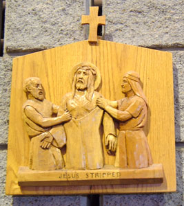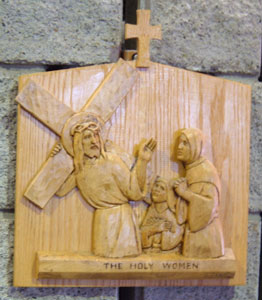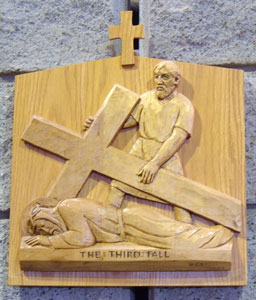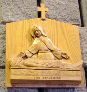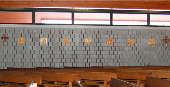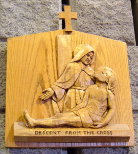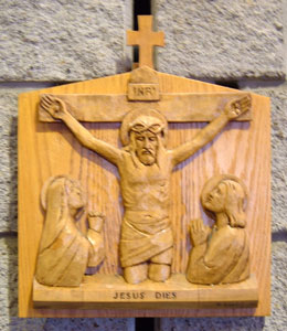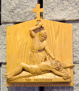 These 14 traditional stops in the Passion and Death of Jesus represented in wooden sculpted bas-relief, are windows bringing us deeper into Jesus' Way of the Cross. Through prayer and devotion, alone and in groups, we give the Lord our consent to reproduce in us Jesus' own attitude of willing surrender and obedience to the Father, forgiveness of enemies and tormentors, outpouring love and compassion, faith and hope with fidelity to the end. We pray and meditate on Jesus' Passion with these stations before weekday Masses during Lent.