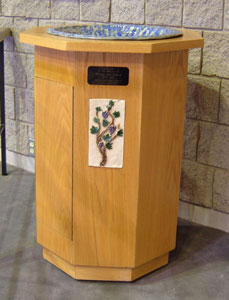Decorated with beautiful symbols of our faith, this font was made by parishioners Richard and Fran Merlo to replace the one burned in the fire. Its water is blessed