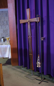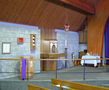 The Ambry is the repository for the holy oils blessed by the Archbishop in Holy Week each year at the Chrism Mass. All the priests who can gather around the Archbishop, renew their ordination promises, and then the Archbishop blesses the holy oils for the Catechumens and the Sick. The Catechumens are those who are not yet baptized who are strengthened by this oil to live the Christian life and receive the other sacraments. People can be anointed whenever they become sick or when their illness becomes more serious, or before an operation. The Holy Chrism is not just blessed, it is consecrated, which means it is to be used by God to give a special participation in the holiness and power of God to persons and things. Holy Chrism is used in Baptism to make the newly baptized temples of the holy indwelling of the Blessed Trinity. It is used at Confirmation to fill the confirmand with the Holy Spirit and mark them with the character of Christian, a disciple of Jesus. It is used in Holy Orders to give a new priest - on his hands - the power to act in Jesus' Name to sanctify the people of God and to offer sacrifice to God, and a new bishop - on his head - as a mystical anointing to fill him with blessings for the people of God. The Holy Chrism is used to anoint crosses for the consecration of a church and also of an altar. The five crosses on the altar represent the five wounds of Jesus, and the 4 or 12 crosses in the church are for the 4 evangelists or the 12 apostles. (Ambry, chalices and linen donated by Terry Laporte. Ambry designed and built by Bernie Lavigne.)