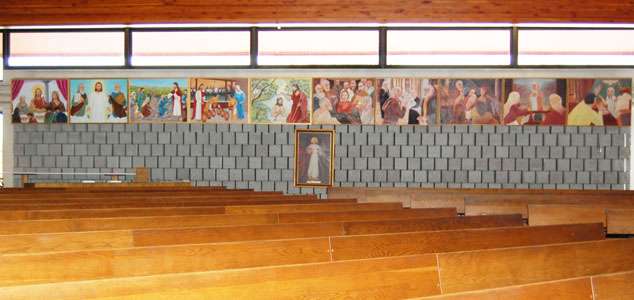 The 15 paintings of the traditional Mysteries of the Holy Rosary - Joyful, Sorrowful, and Glorious - were painted by a man from St. Gabriel Parish in Pointe St. Charles, Frank Morahan, who donated them to Fr. Gilles Surprenant in 1989 for use in a church for the glory of God. When Pope John Paul II called a Year of the Most Holy Rosary for October 2002 to October 2003, our Pastor and the Liturgy Committee put up the paintings and asked parishioners to paint the 5 new "Luminous" Mysteries. Flora Markic painted Cana, Jesus Preaching, and the Transfiguration. Ann McDonald painted the Baptism and the Last Supper. These paintings are very helpful to parishioners for praying the Rosary and also for parents of young children to help them catechise their children about the Rosary and the Mysteries, which reveal aspects of Jesus' life and of the role of Mary his Mother in his work of salvation. The paintings below are on the tabernacle side of the church.